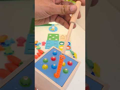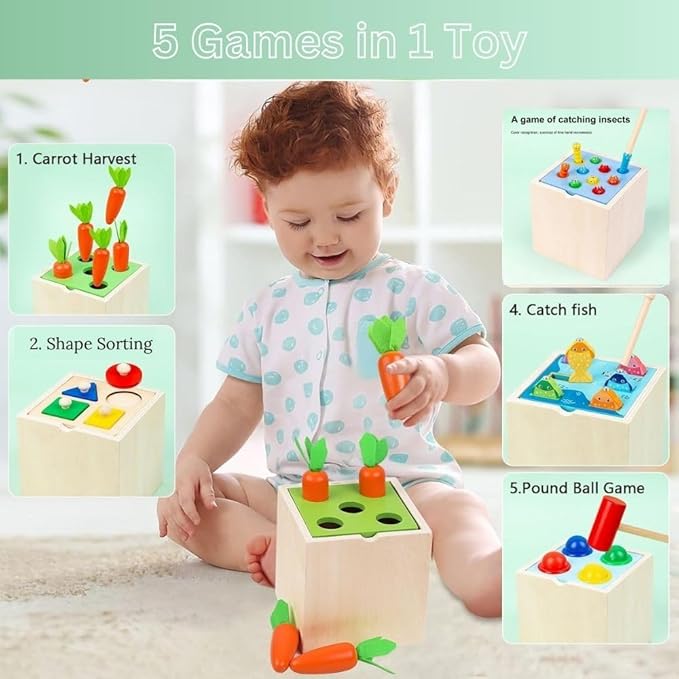 5 in 1 Wooden Cube Montessori Play Set – Carrot Harvest, Fishing, Shape Sorter & Pounding Toy | Educational Gift for Toddlers