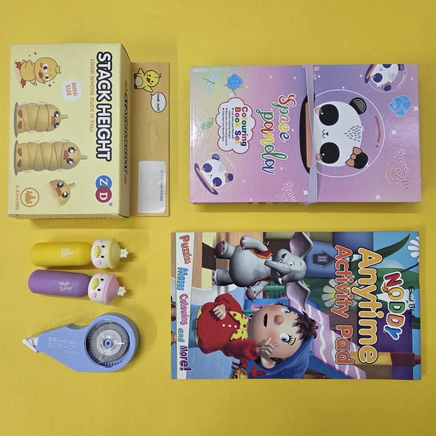 A fun and creative hamper designed to keep kids engaged with coloring, puzzle games, and cute stationery. This hamper includes a 24-piece color and scratch book set, activity books, and creative tools that help improve imagination, creativity, and problem-solving skills. Perfect for return gifts, birthday gifting, and fun learning activities.
