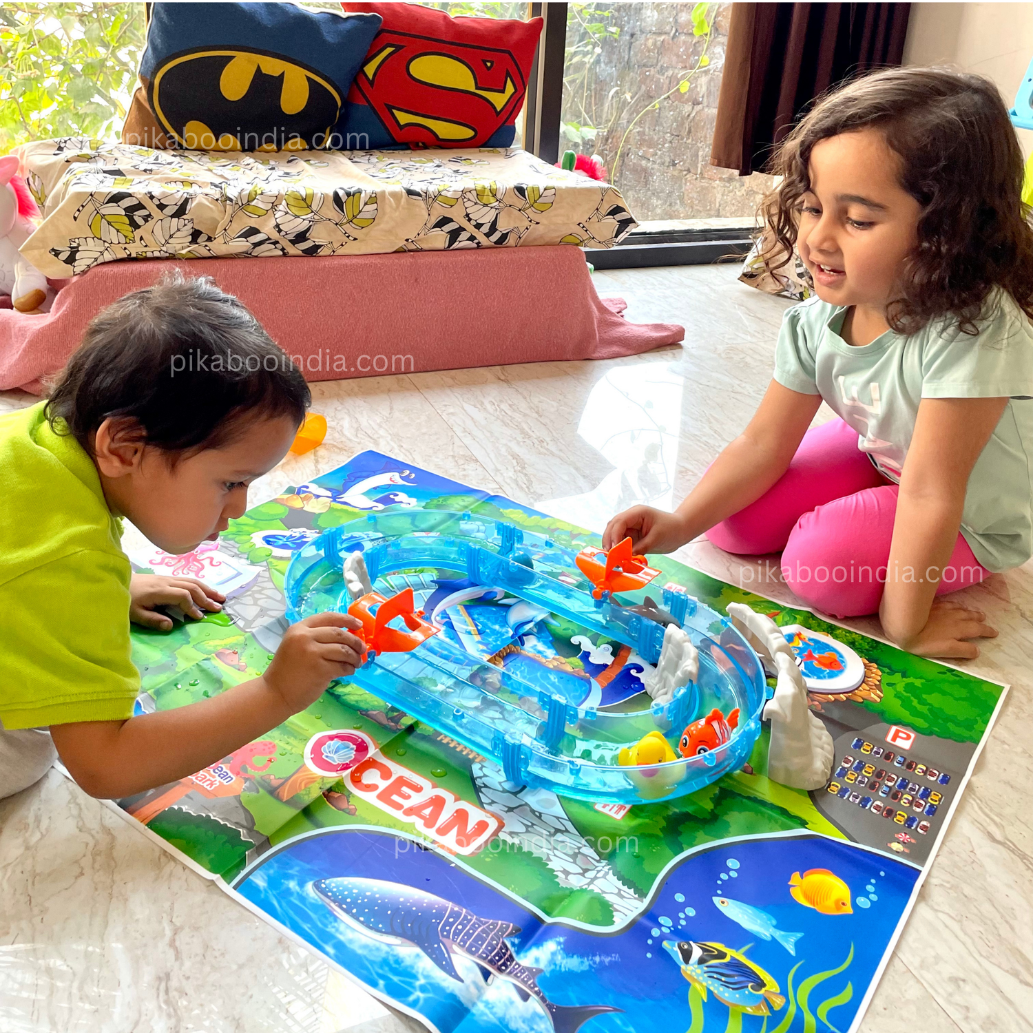 **Water Magic Book will be of assorted design as available. Make a splash with the Ocean Track Water Slide Park Set – a vibrant fish-themed adventure toy that brings the excitement of a water park right to your home! This interactive playset includes colorful sliding tracks, water-splashing features, and cute ocean creatures that zoom, swirl, and splash along the track.