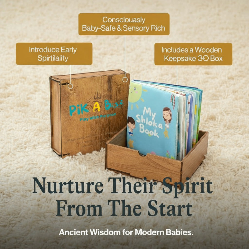 Introduce your little one to ancient wisdom with the PiK A BOO Shloka Cloth Book, designed exclusively for infants, toddlers, and young kids. This soft, baby-safe cloth book includes simple Sanskrit shlokas printed in large fonts, paired with a crinkle sound page to engage sensory development. It comes packaged in a beautiful ॐ-engraved wooden keepsake box, making it a cherished gift for early spiritual learning.