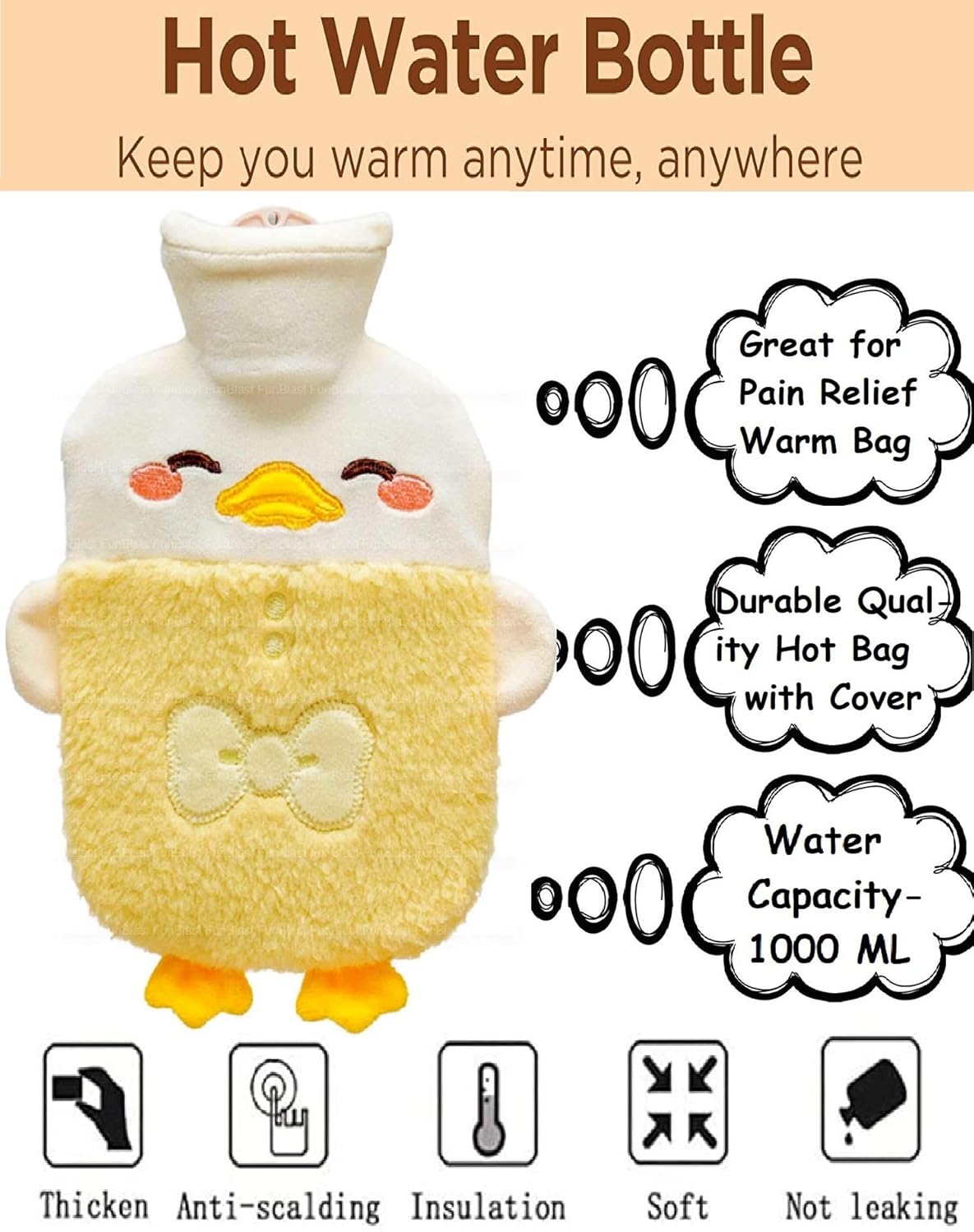 Cute Duck Hot Water Bottle – Yellow 1000ml Cozy Bag with Soft Plush Cover