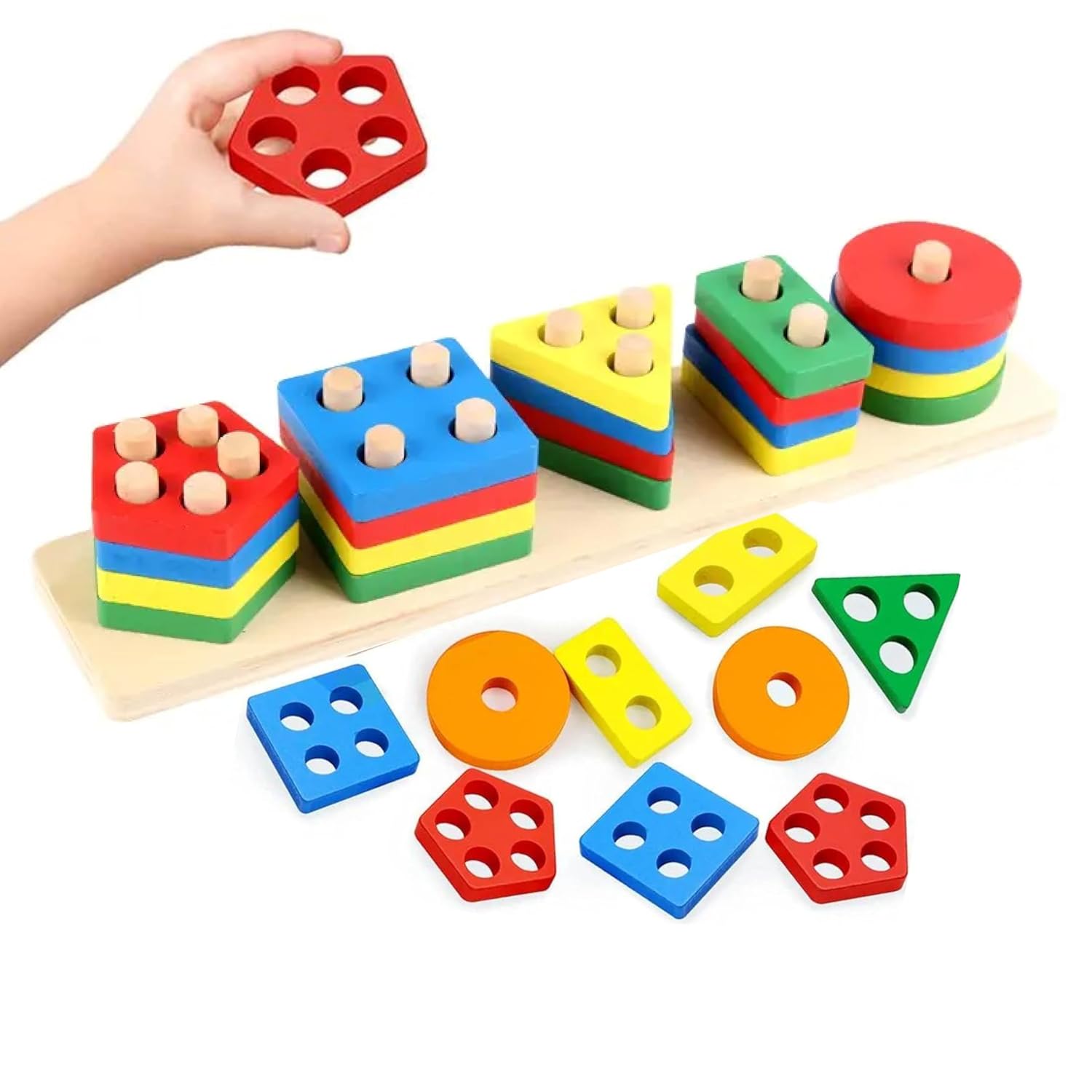 The set includes multiple geometric blocks and sturdy wooden columns, making it a safe, durable, and engaging activity for kids. Perfect for early learning at home, in classrooms, or as a thoughtful gift for birthdays and special occasions.